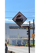 RN.オレンジじいさんが撮影した“踏切注意”の標識。今は電車なので汽車の絵は珍しい!