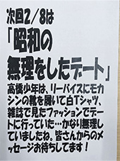 さて、次週はテーマチェンジ。「昭和の無理をしたデート」で行きましょう。リーバイスとモカシンの靴を履いて白Tシャツ、雑誌で見たファッションでデートに行くのはかなり無理していた高橋少年です。